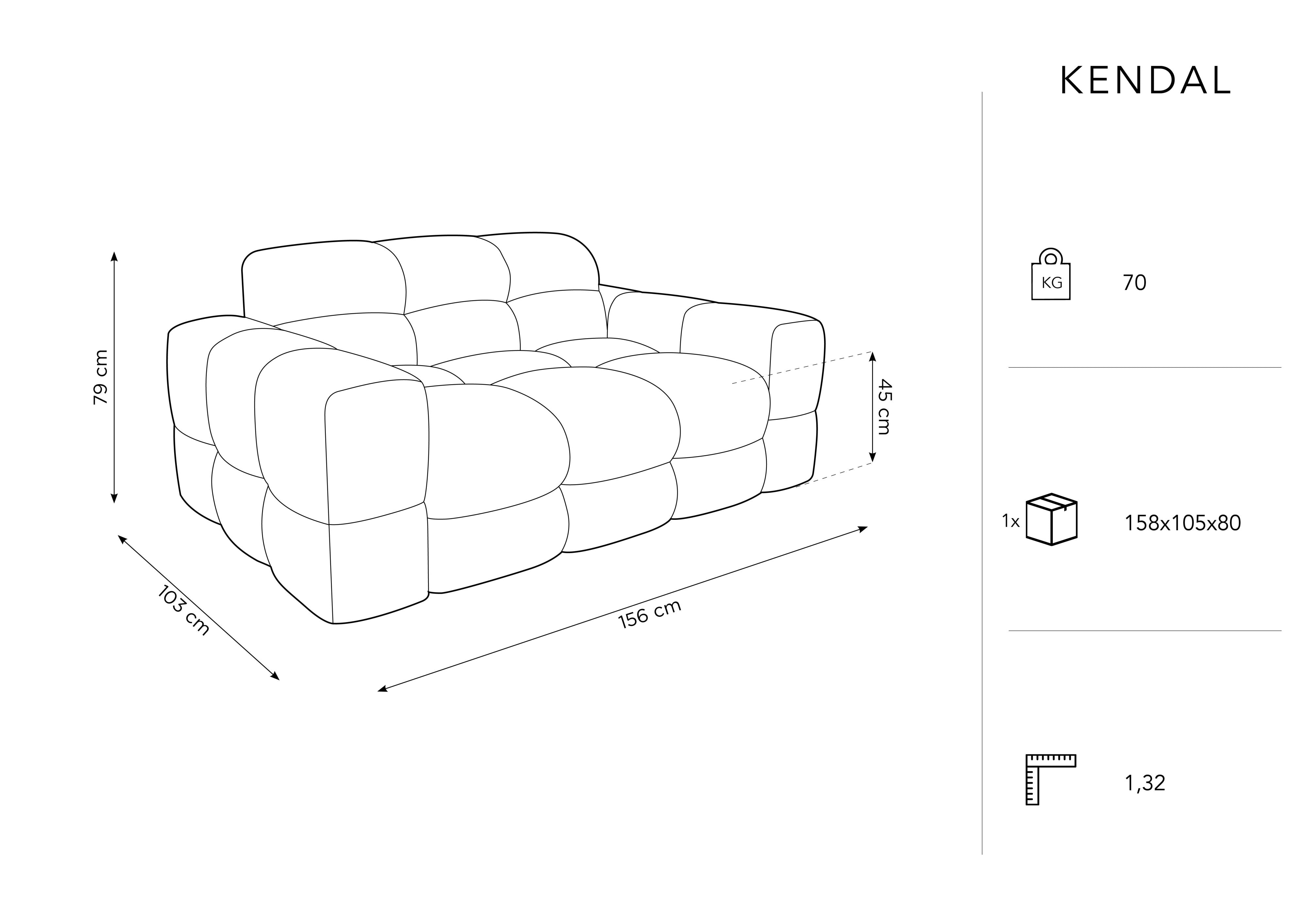 Sametová pohovka pro dvě osoby Kendal okouzluje neobyčejným prošíváním a prošívaným designem, které dodají interiéru výjimečnou eleganci v moderním klasickém stylu. Bublinkové sedadlo v kombinaci s širokými opěrkami a stylovým opěradlem vytváří pohodlné místo k odpočinku po náročném dni.Kendal překvapuje poněkud avantgardní formou a přitahuje pozornost, bez ohledu na to, z jaké strany se na ni podíváme.