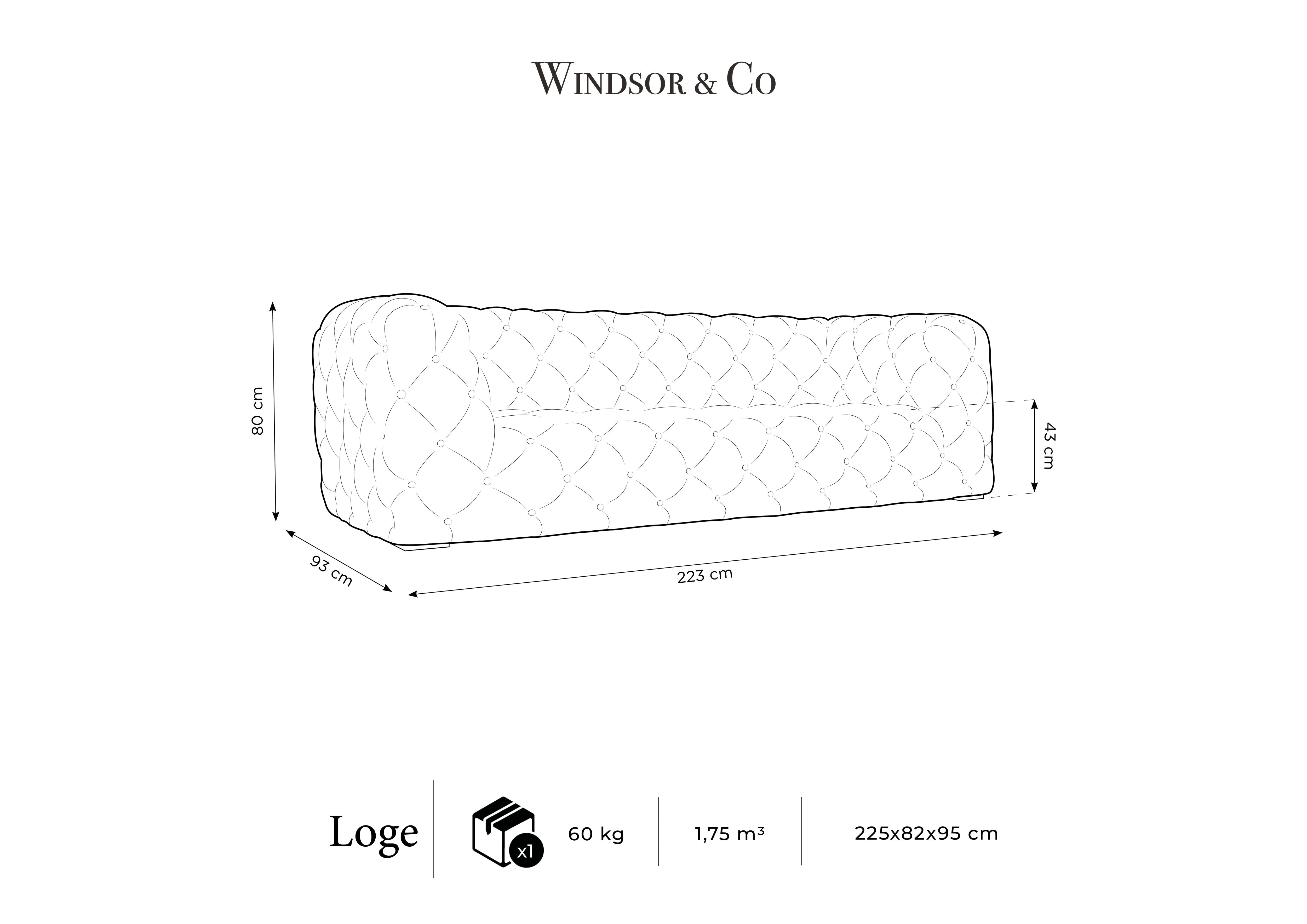 Opěradlo, široké a pohodlné područky a základna sedáku tvoří jeden, soudržný celek. Potah je vyroben z odolné a na dotek měkké sametové tkaniny. Loge se vyznačuje neobyčejnou kvalitou zpracování, která zaručuje dlouhé roky užívání.