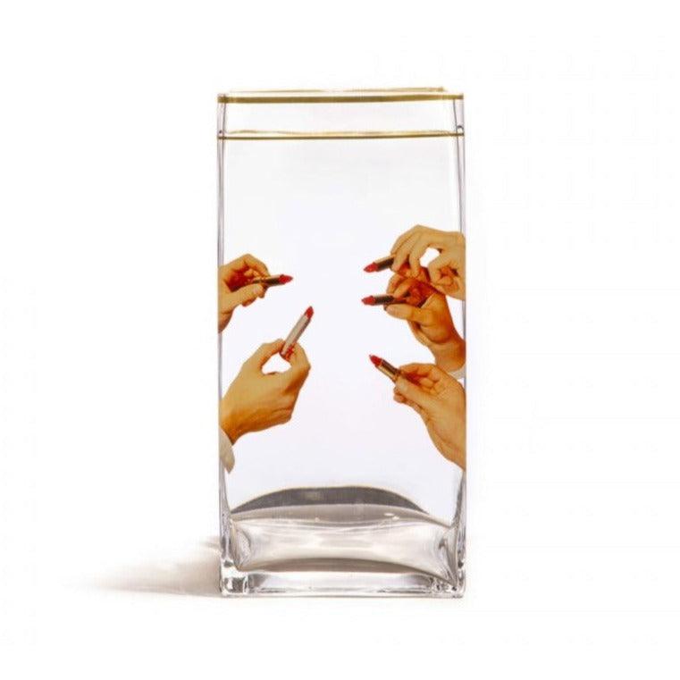 Váza Lipsticks je model vyrobený z vysoce kvalitního skla, které tomuto prvku dodává lehkost a svěžest. Jednoduchý a minimalistický tvar je doplněn zlatými detaily a také bláznivou grafikou znázorňující ruce s červenými rtěnkami. Barevné prvky dodávají váze charakter, zatímco zlaté detaily jí dodávají na eleganci. Návrh vázy pochází z dílny značky Toiletpaper Home, která se specializuje na vytváření jedinečných designových prvků, od kterých se těžko odtrhnete.