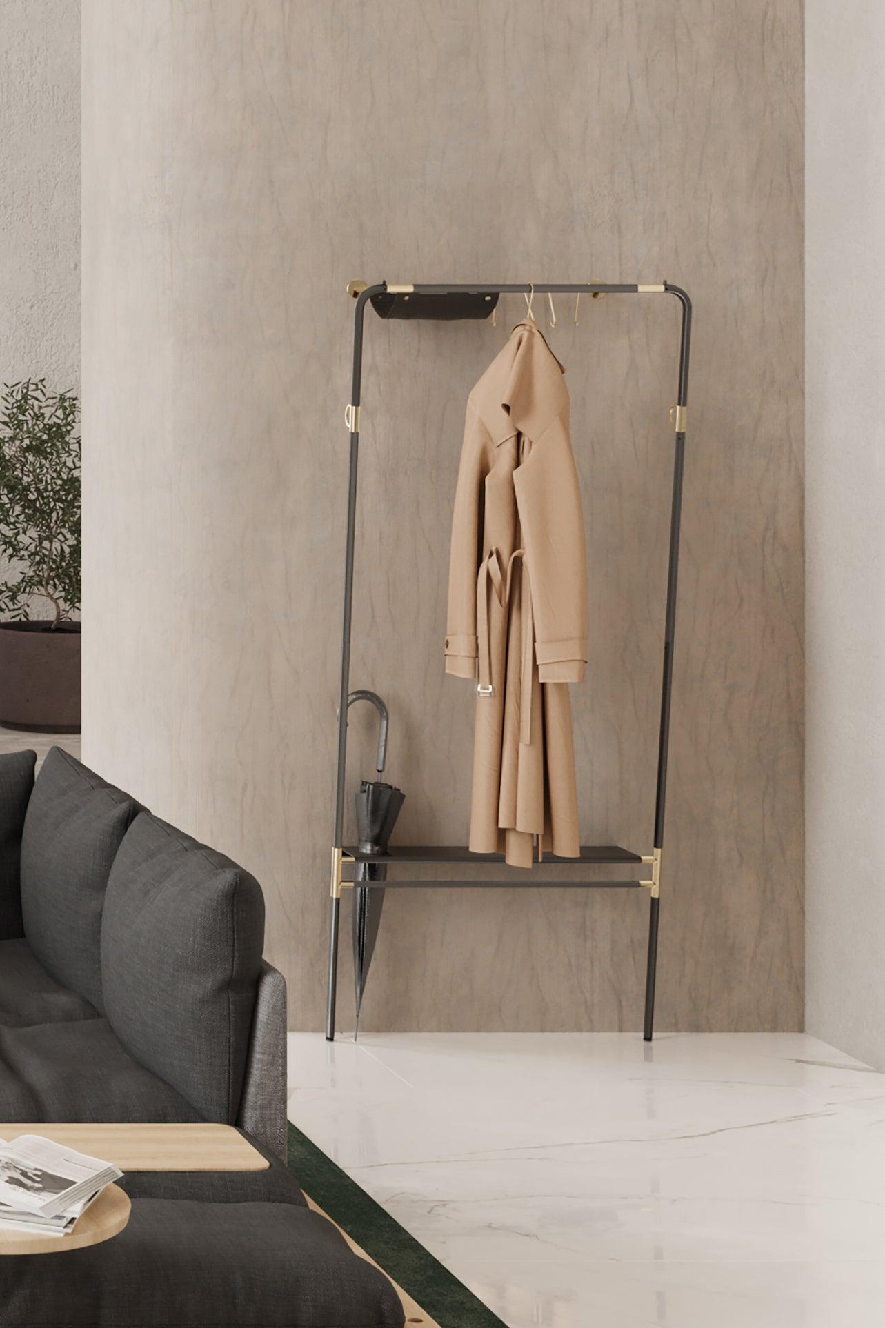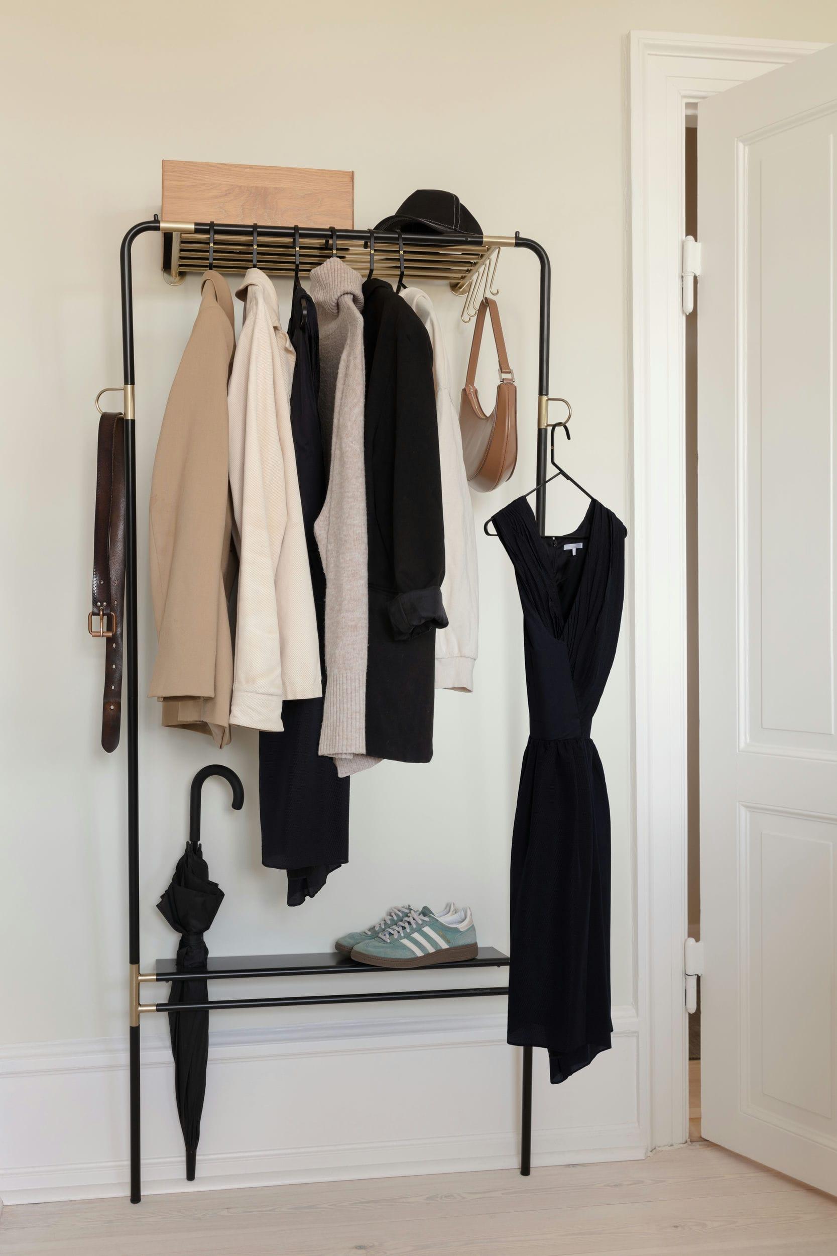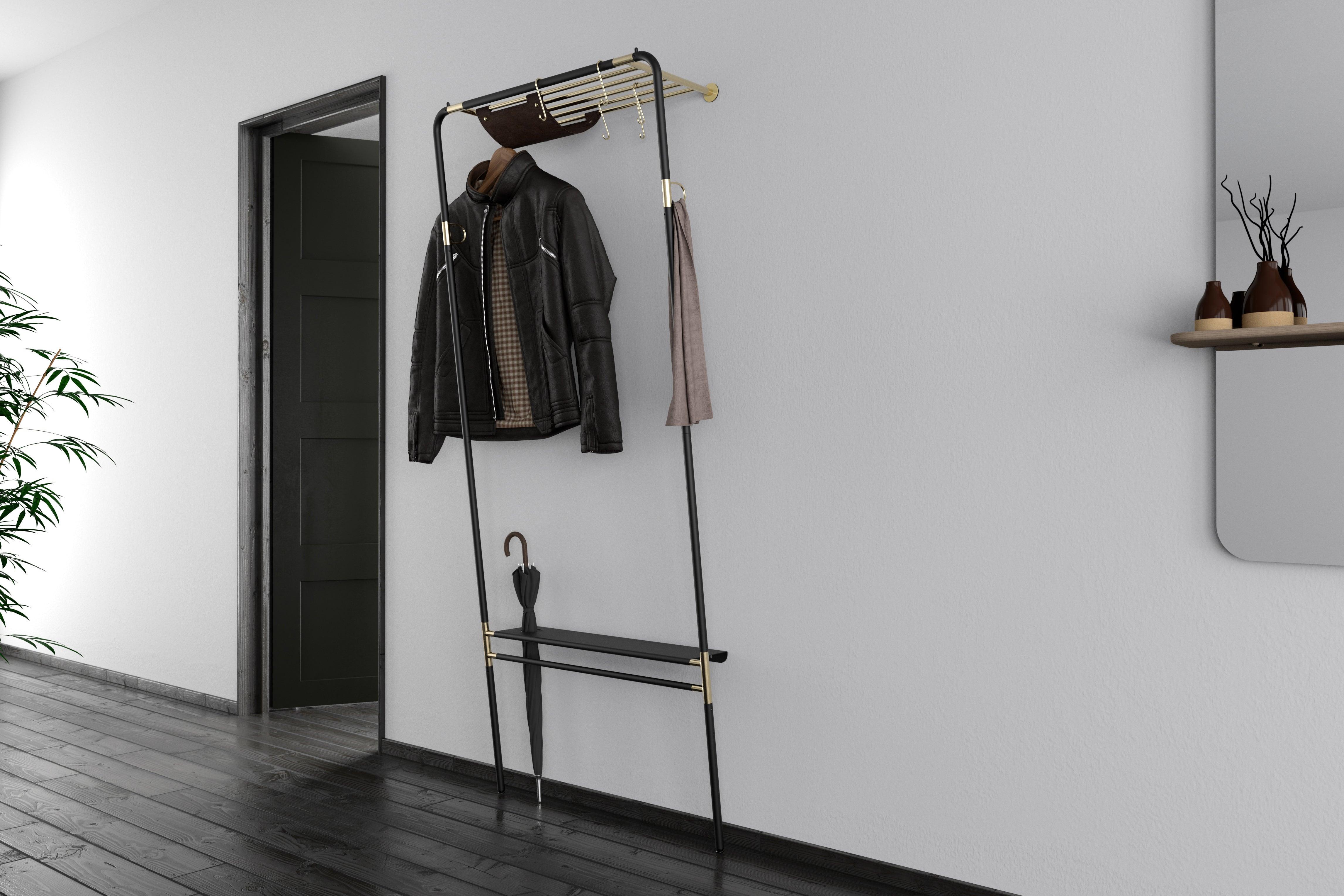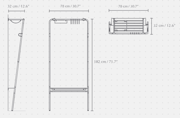 Hanger na oblečení Lean On Me byl navržen tak, aby umožnil pohodlné uložení všech nezbytných věcí na čerstvém vzduchu, přičemž maximálně využívá dostupný prostor. Jeho inovativní design mu umožňuje opírat se pod úhlem o zeď u základny, což znamená, že zabírá minimální množství místa na podlaze.