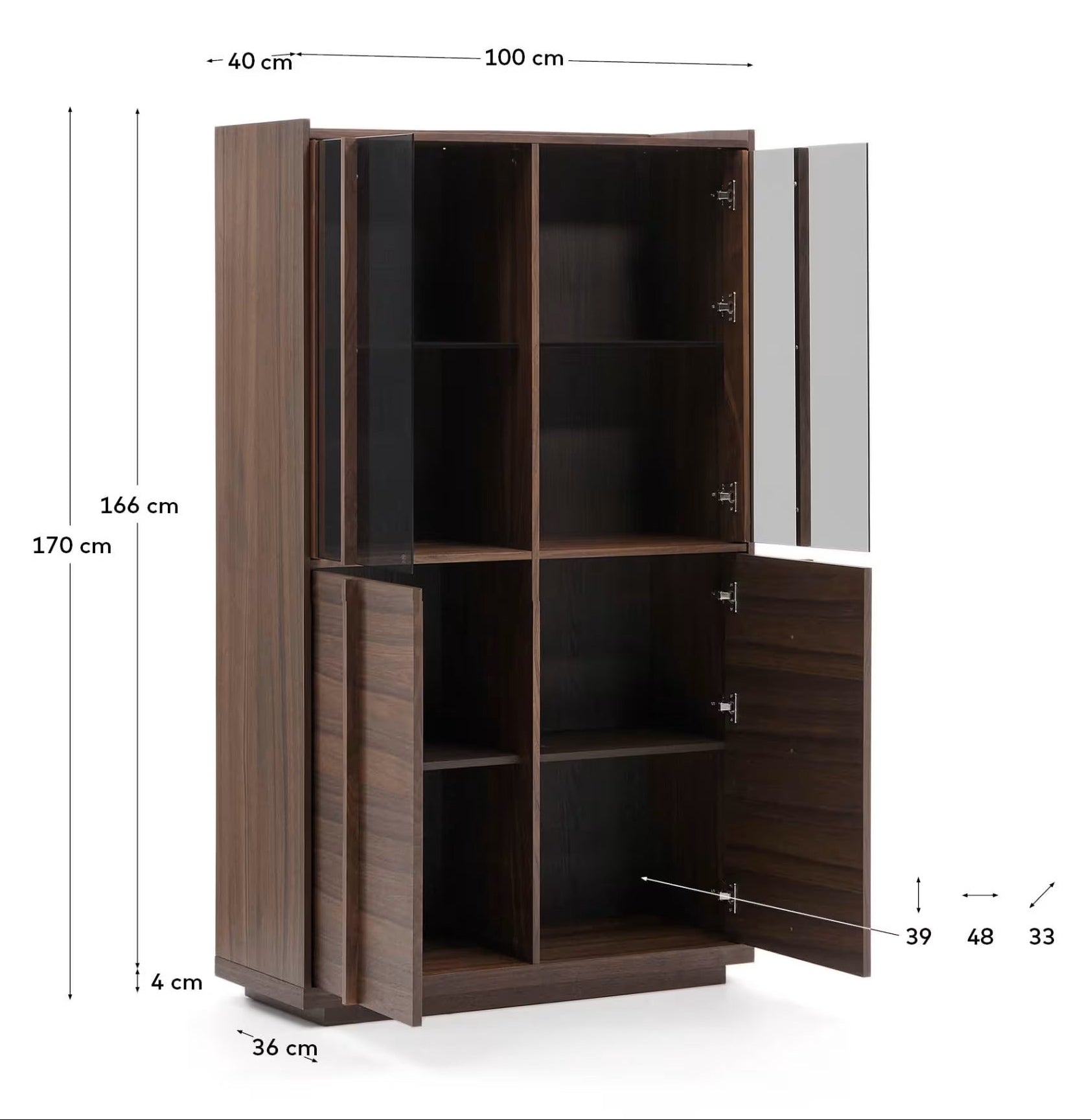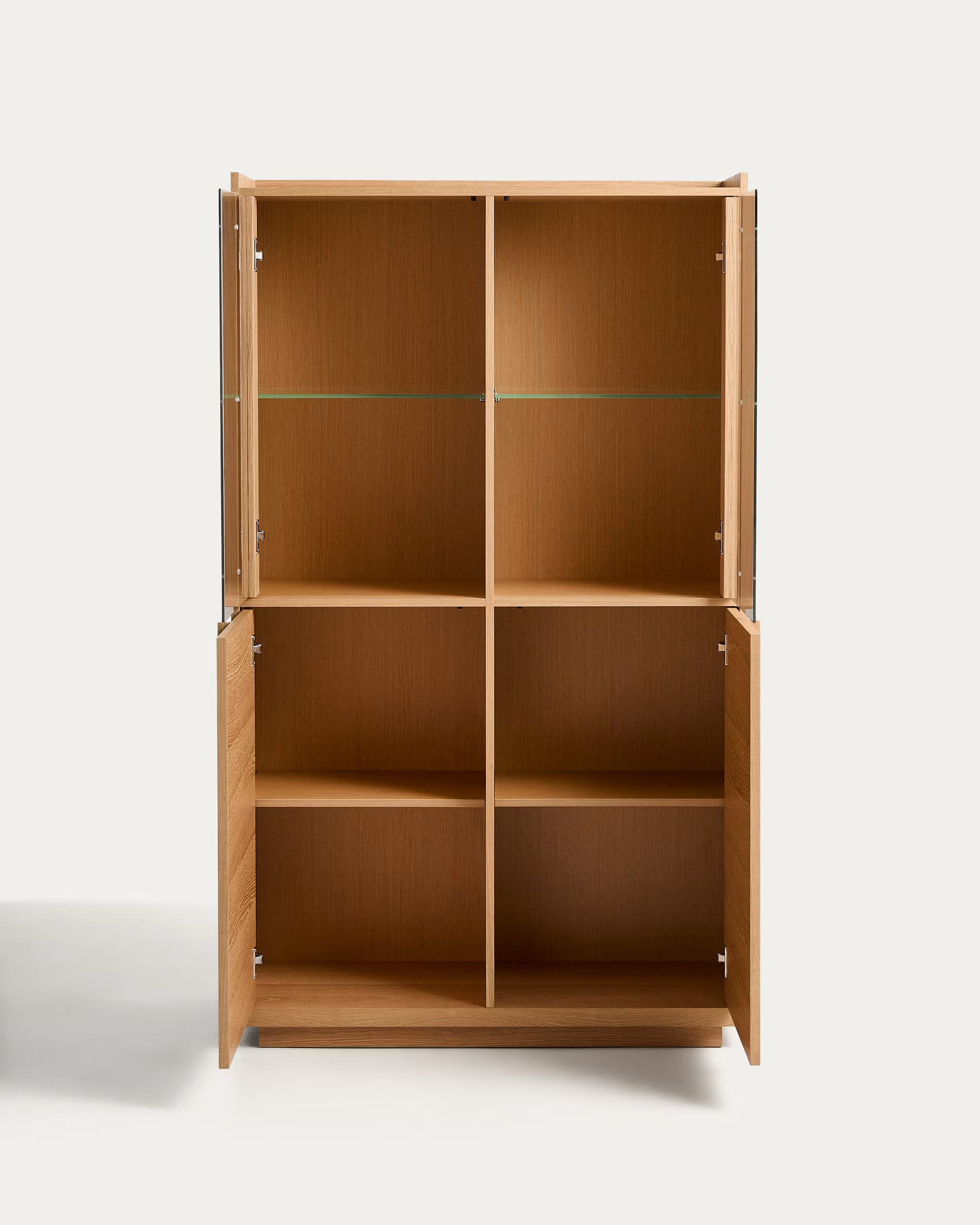 Promyšlená konstrukce spojuje funkčnost s estetikou – horní část s prosklenými dveřmi ideálně vystavuje dekorace, zatímco dolní část poskytuje praktický prostor pro ukládání. Čtyři dveře se systémem tichého zavírání a nastavitelnými panty zaručují komfort používání, a nastavitelné police umožňují přizpůsobit vnitřek individuálním potřebám. To je stylová vitrína do obývacího pokoje nebo jídelny, která spojuje vysokou kvalitu zpracování s odpovědným přístupem k výrobě díky využití dřeva s certifikátem FSC.