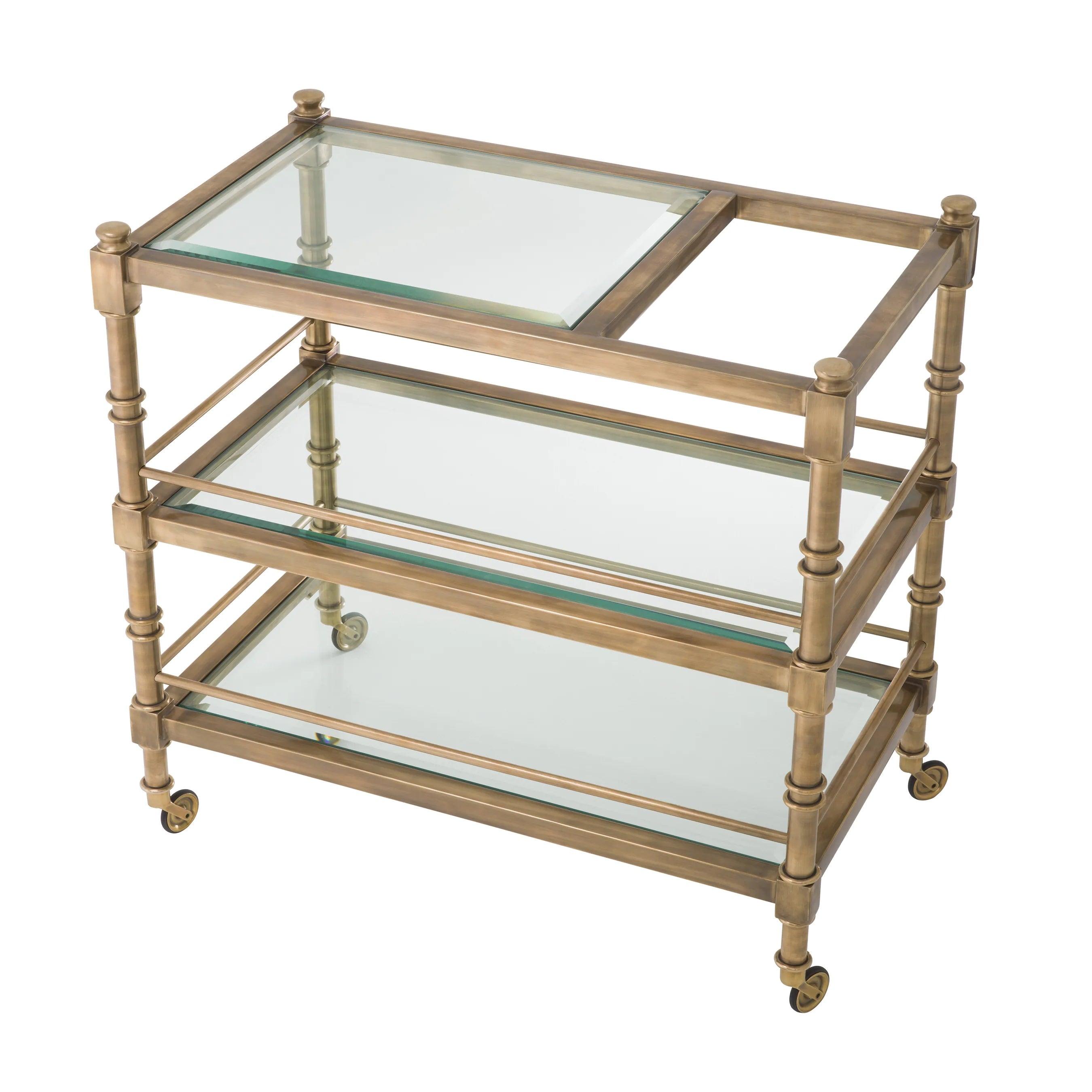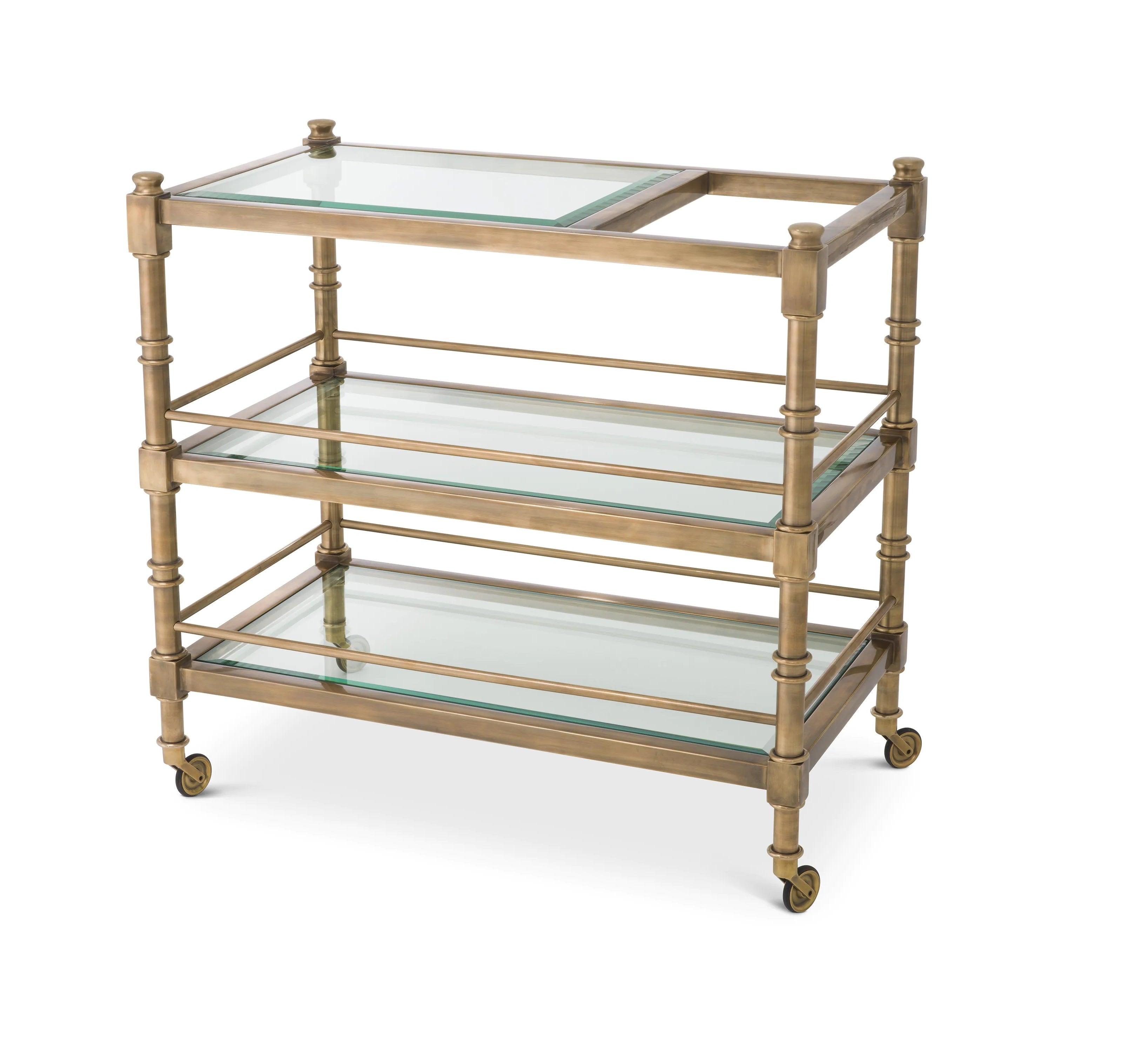 Wózek Alexia to połączenie stylu vintage z funkcjonalnością, które przenosi Cię w czasy dawnej elegancji. Mosiężne wykończenie dodaje meblowi subtelnej elegancji, której staroświeckie piękno jest dodatkowo podkreślone przez trzy półki z fazowanego przezroczystego szkła. Te półki to idealne miejsce do przechowywania Twojej kolekcji alkoholi, szklanek oraz innych niezbędnych akcesoriów barmańskich. Aby zapewnić bezpieczeństwo Twoim przedmiotom, Alexia jest wyposażona w eleganckie listwy boczne, które nie tylko dodają charakteru, ale przede wszystkim chronią przed przypadkowym upuszczeniem przedmiotów. Unikalna konstrukcja, w której górna półka jest mniejsza niż dwie dolne, umożliwia łatwy dostęp do butelek i szkła, co sprawia, że korzystanie z wózka staje się czystą przyjemnością.