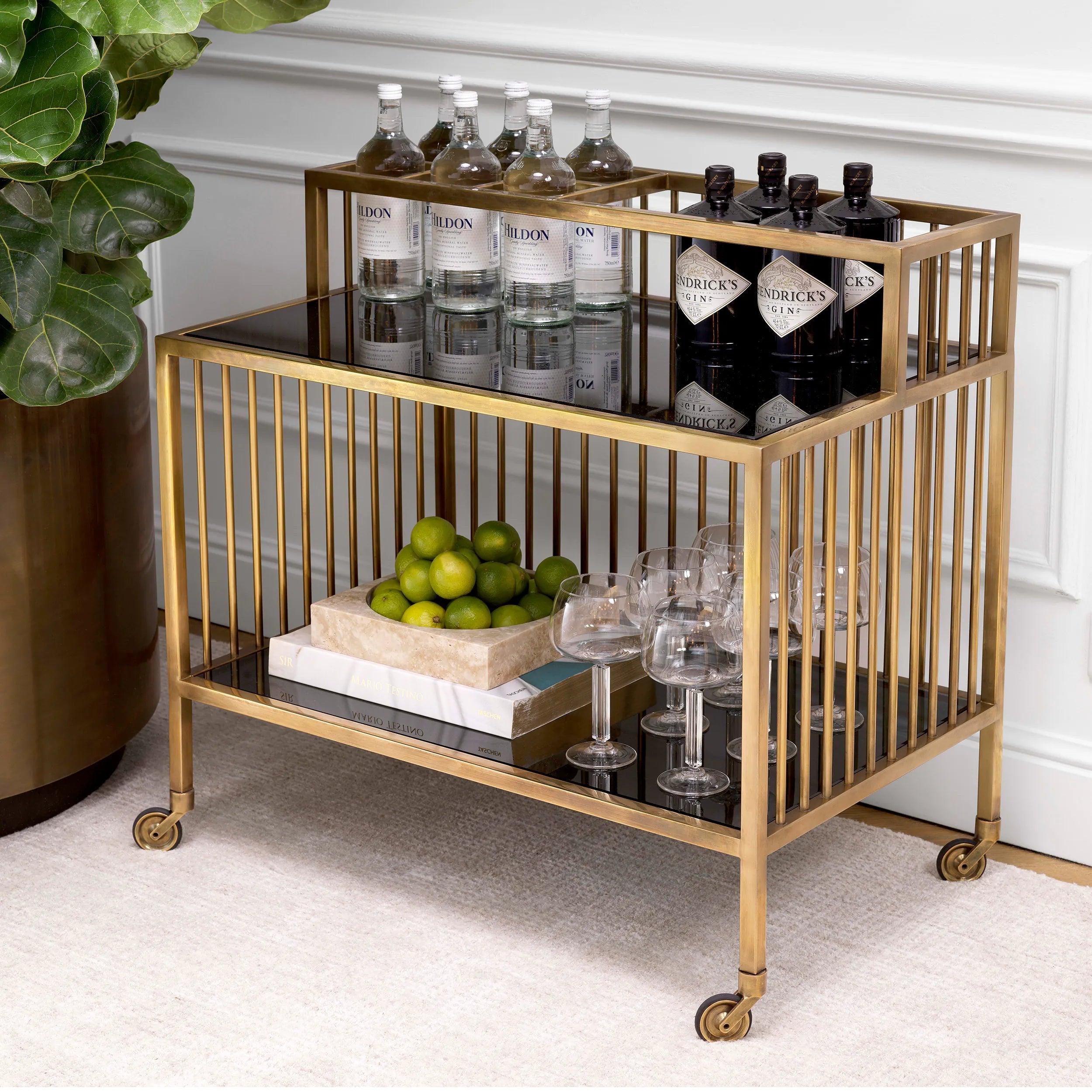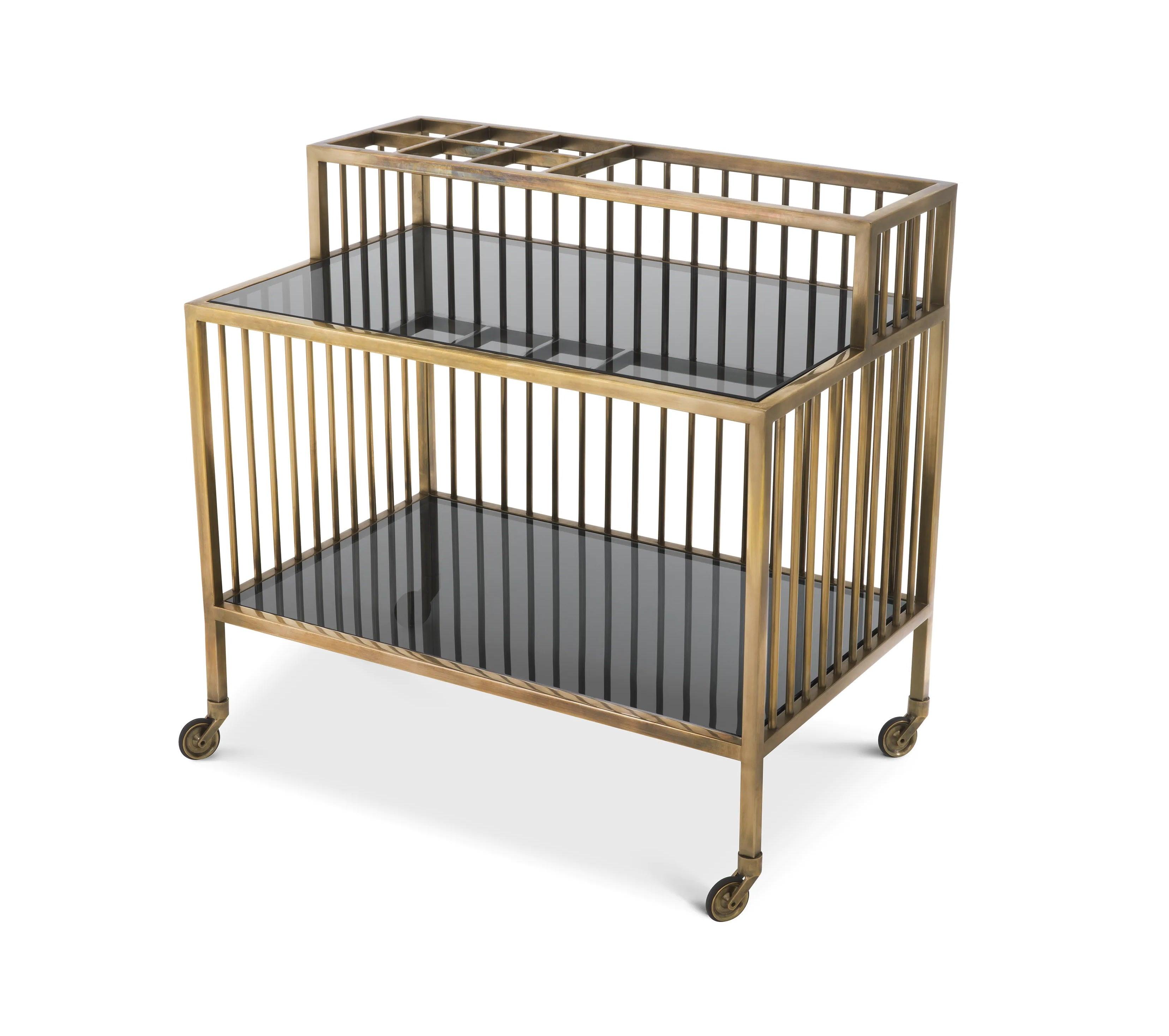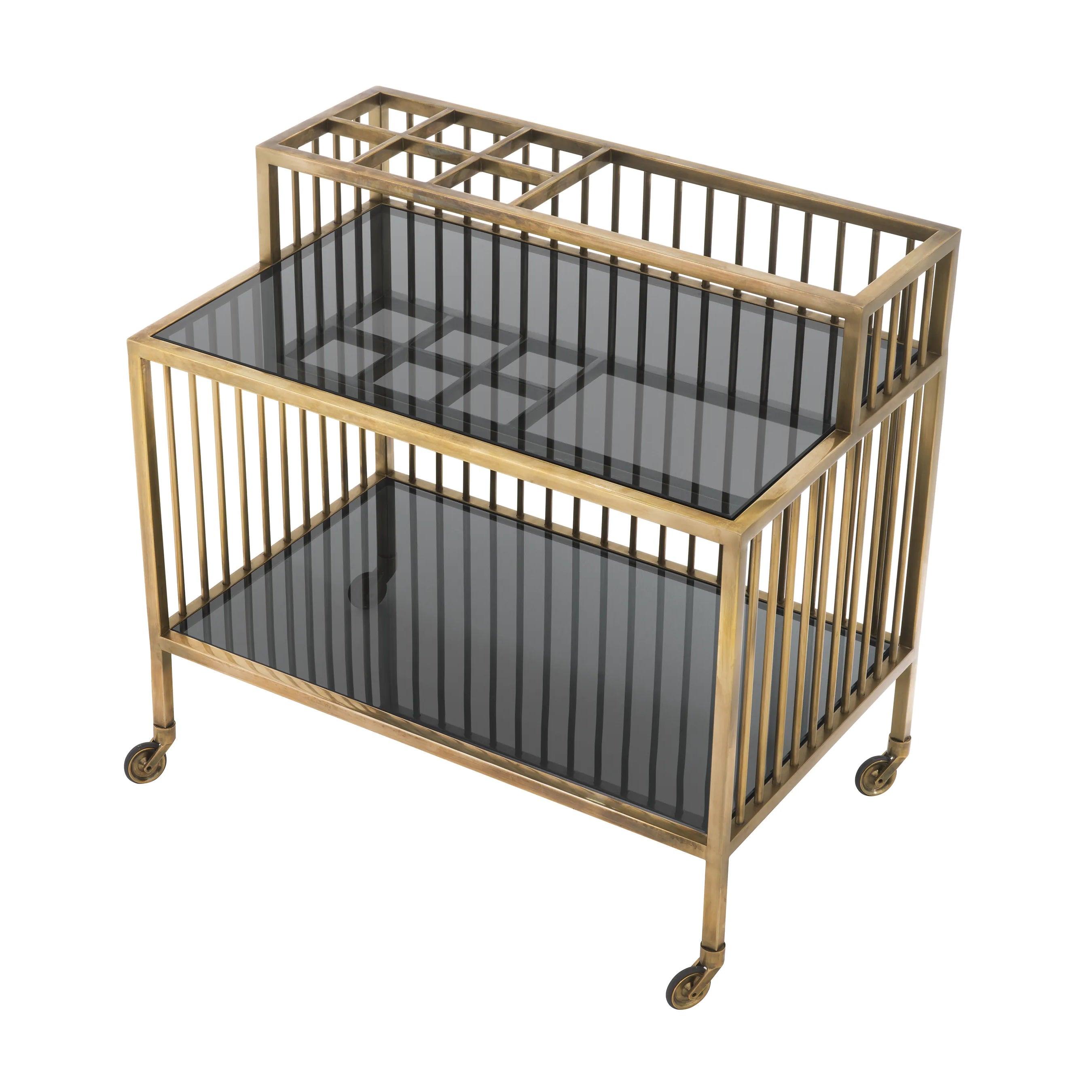Wózek barowy Rutherford to harmonia estetyki dawnych lat z nowoczesną elegancją. Mosiądz z wykończeniem w stylu vintage przypomina o uroku minionych epok, podczas gdy przydymione szkło otula go aurą tajemniczości. Niezastąpiony przy serwowaniu ulubionych trunków mosiężny wózek może również pełnić funkcję wyjątkowej gabloty dla drogocennych skarbów. Jego obecność w pomieszczeniu jest niczym artystyczny akcent, łączący w sobie klasykę z nowatorską formą. Rutherford to więcej niż wózek – to deklaracja wyrafinowanego gustu i zamiłowania do detalu.