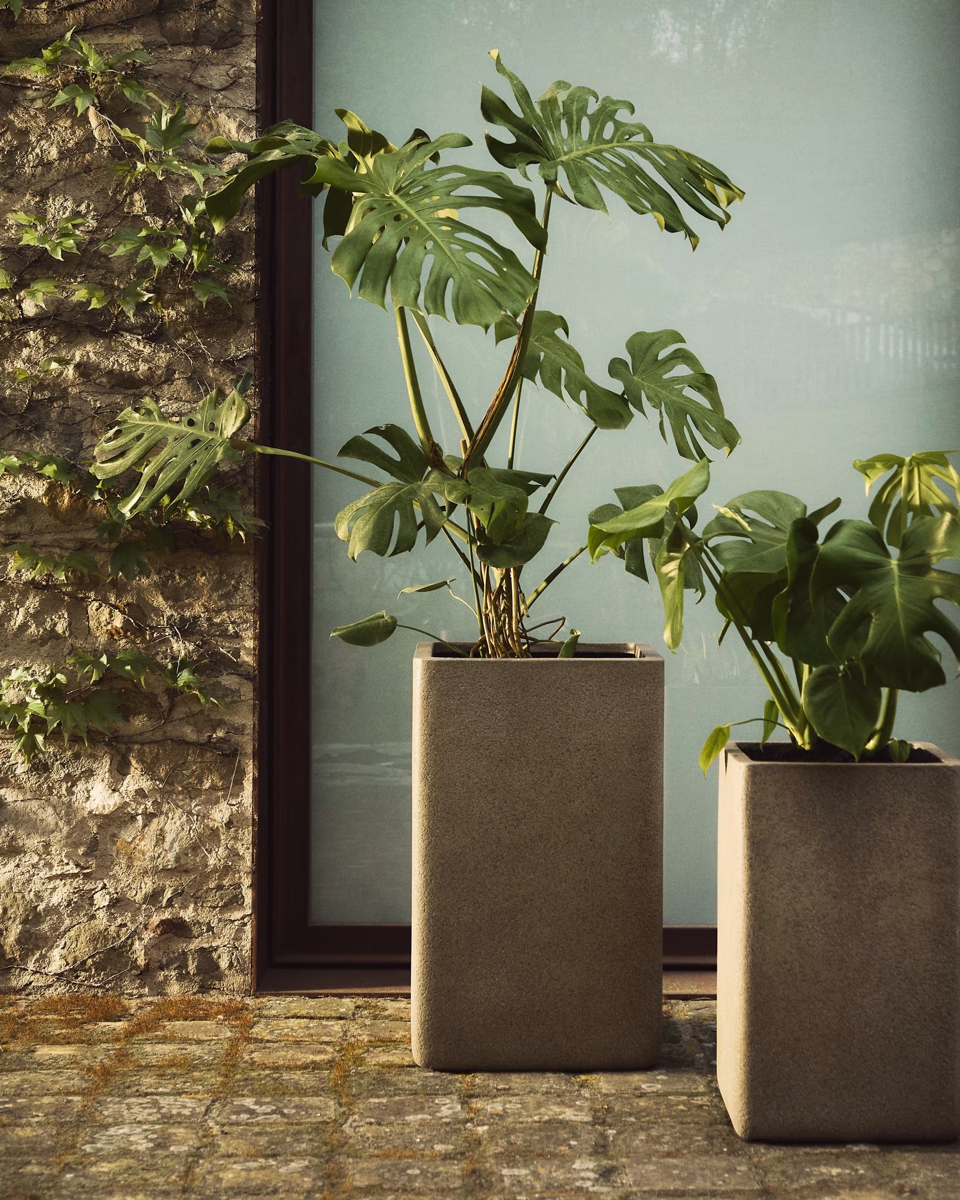 Sada vysokých květináčů Minoa je vyrobena z policementu — materiálu složeného z pryskyřice a kamenného prášku, který napodobuje kamenný vzhled, a nabízí vysokou odolnost a lehkost. Květináče mají odtokový otvor na dně, což umožňuje správné odvádění přebytečné vody. Jejich jednoduchá, kubická forma a tmavé provedení je činí univerzálním doplňkem jak pro vnitřní, tak pro venkovní prostory, dodávající aranžmá moderní a elegantní charakter.