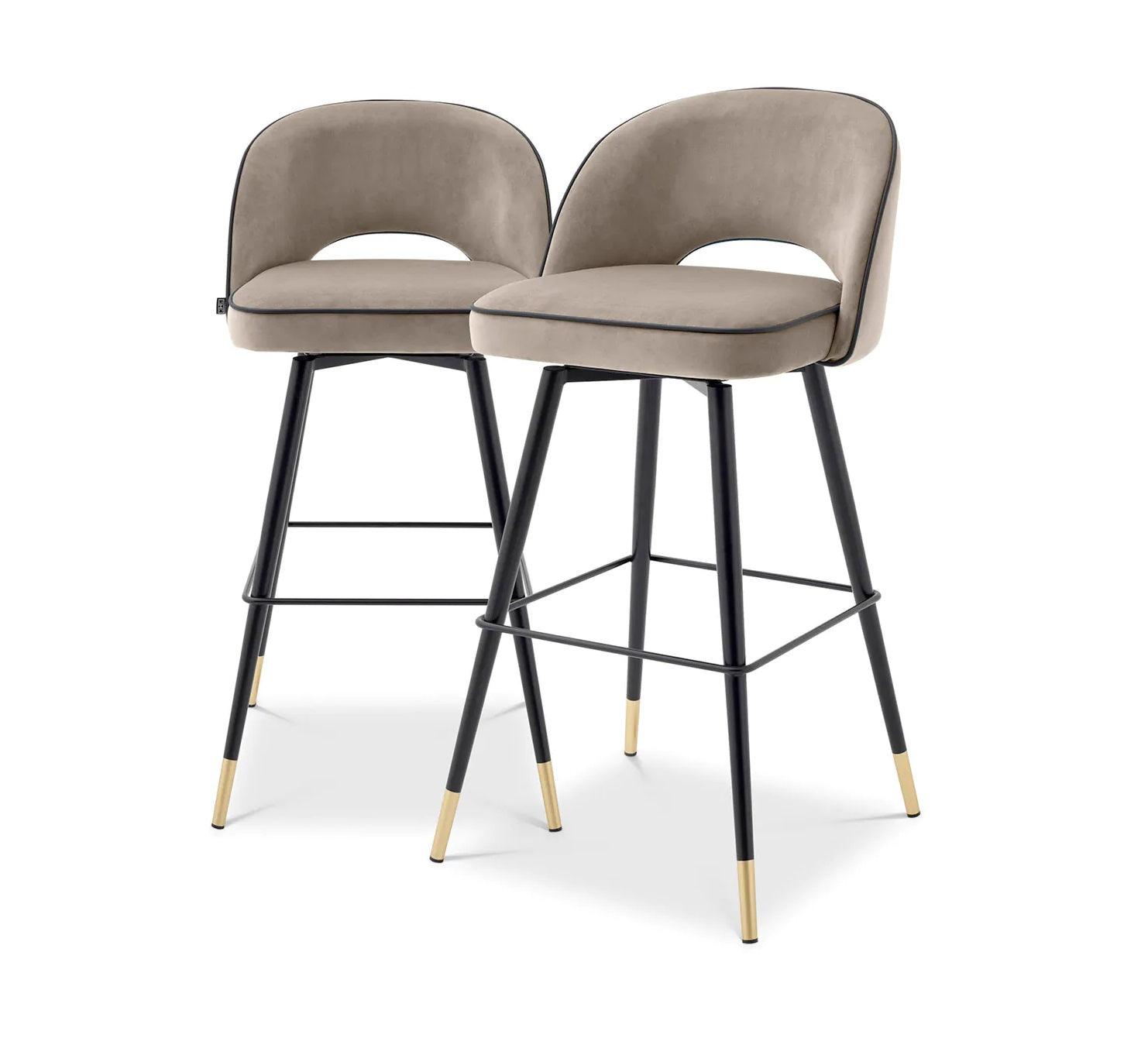 Pečujte o eleganci a rafinovanost svého interiéru díky hokerům Cliff. Sada dvou sametových hokerů představuje esenci luxusu a třídy. Každý hoker má pevnou konstrukci, která spočívá na černých, zúžených nohách s dokonalým akcentem v podobě zlatých krytek. Jejich jedinečnost podtrhuje opěradlo bez rukou, které bylo umělecky otevřeno na spodní části před sedadlem, čímž designu dodává lehkost.