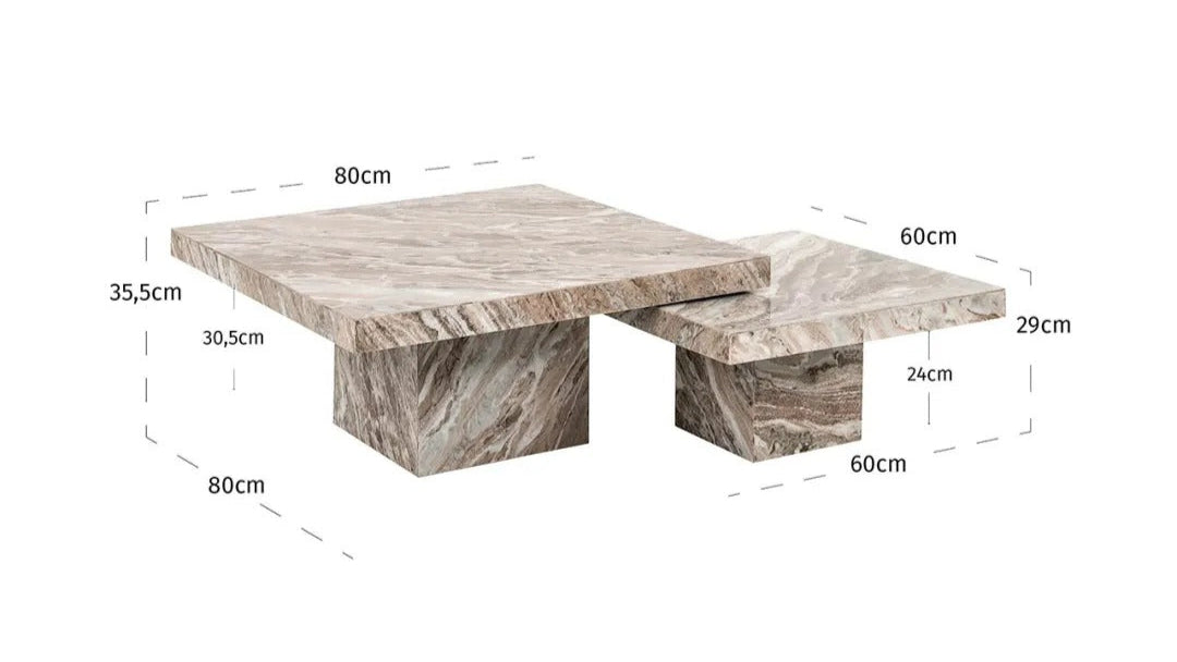 Impozantní souprava konferenčních stolků Rashford vyrobená výhradně z přírodního mramoru Toronto je rafinovaným prvkem interiérového designu, který okouzluje svou pevností a elegancí. Čtvercová deska o tloušťce 5 cm spočívá na masivním, geometrickém podstavci, což dodává nábytku sochařský charakter. Jemná paleta béžových a šedých odstínů, typická pro kámen Toronto, vnáší do interiéru pocit luxusu a přirozené harmonie.