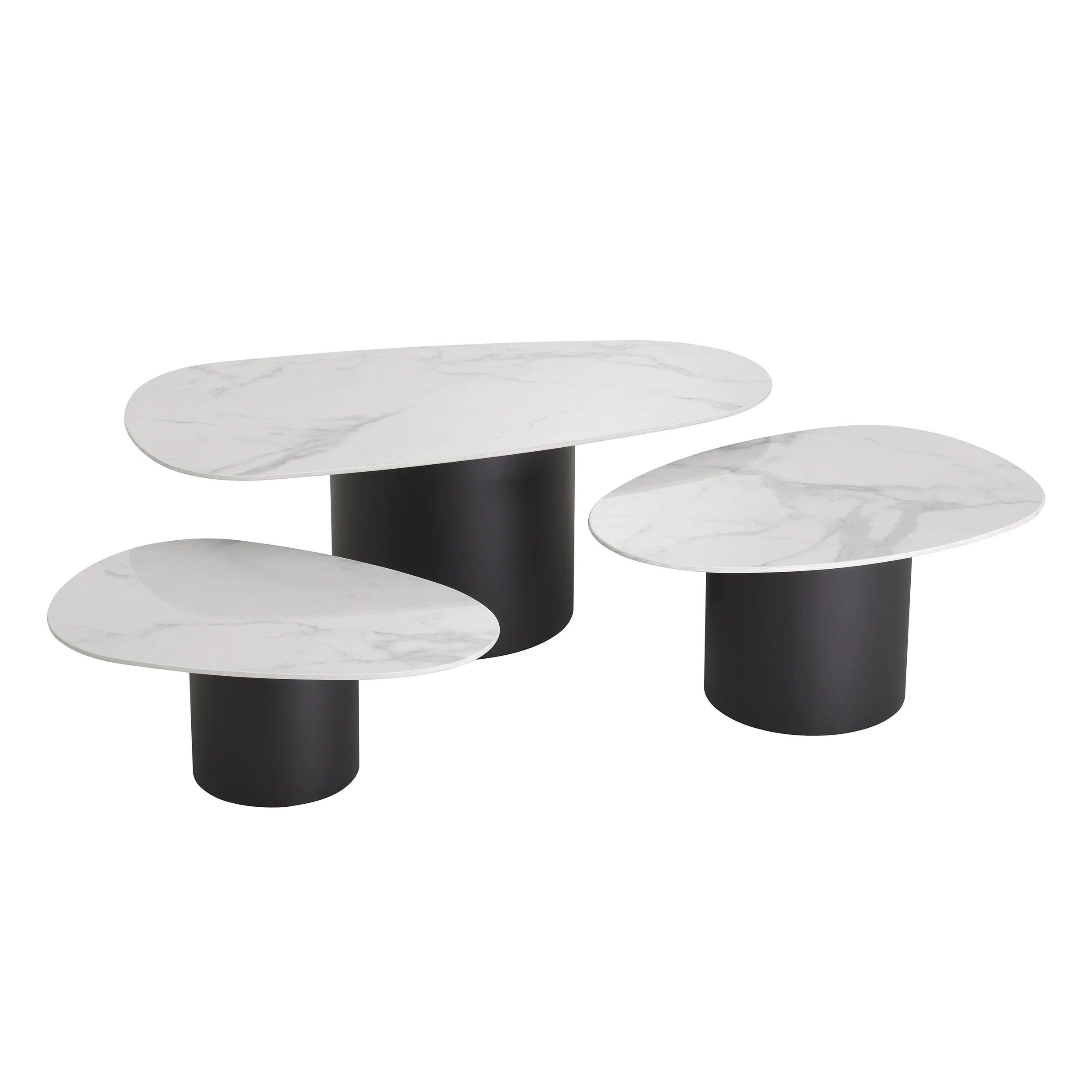 Sada konferenčních stolků Zane je spojení klasiky a modernity v jednom. Tři nezávislé prvky, každý s unikátním tvarem kamene, nabízejí nejen funkčnost, ale také estetické zážitky. Černý, cylindrický podstavec kontrastuje s bílým, mramorovým povrchem desky, což dodává hloubku a charakter každému z těchto stolků.