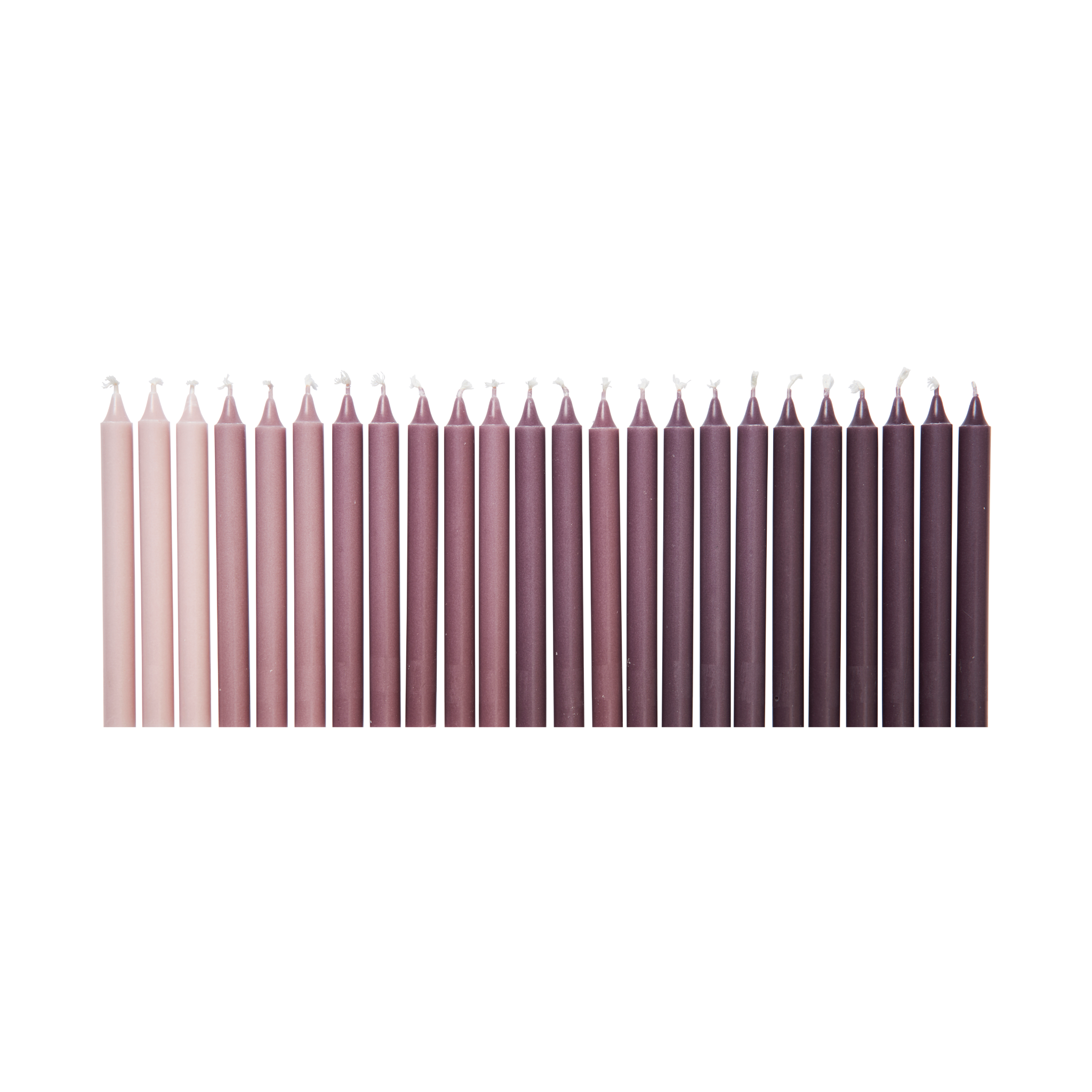 Svíčky Ombre jsou jedinečná sada 24 svíček vyrobených ze 100% čistého stearinu, které okouzlují jemným efektem tonálního přechodu barev. Jejich delikátní gradient od světlého po tmavší odstín růžové vytváří elegantní a útulnou atmosféru, ideální jak pro každodenní použití, tak během svátečních chvil. Díky své štíhlé formě a přirozenému lesku se skvěle hodí k klasickým svícnům i moderním aranžmá stolu.