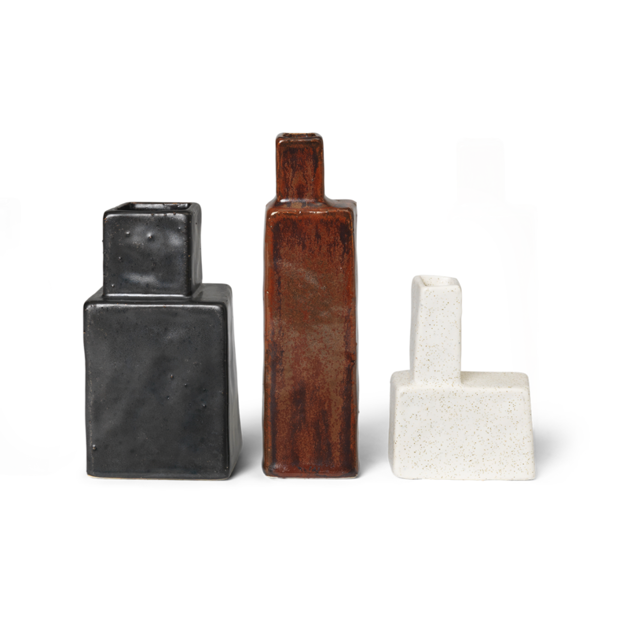 Zestaw trzech wazonów Koa to połączenie brutalistycznej estetyki z surowym, ręcznie wykonanym urokiem. Każdy wazon charakteryzuje się unikalnym geometrycznym kształtem, przywodzącym na myśl architektoniczne formy, a subtelne niedoskonałości w szkliwie nadają im rzemieślniczego charakteru. Różnorodne proporcje i rozmiary – od wysokich i smukłych po niskie i szerokie – tworzą rytmiczną, przyciągającą wzrok kompozycję.